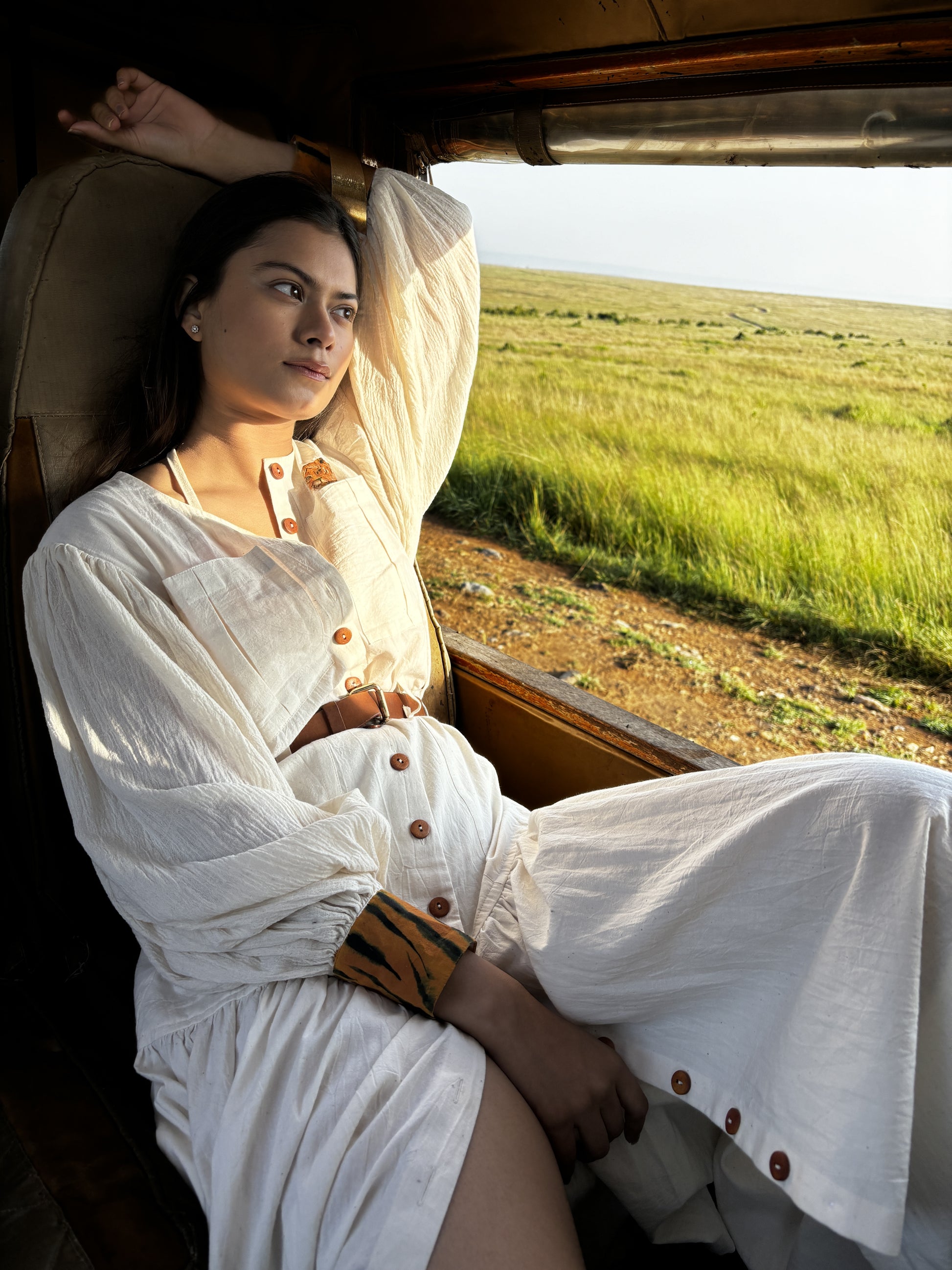 The "Peek-a-Tiger Button Down Dress" is a beautiful blend of structure and artistry, designed to cater to a diverse range of style preferences. This dress features a hand-painted tiger peeking playfully from the pocket, adding a touch of wilderness to your look. The tiger-striped cuffs offer a bold contrast to the elegant, button-down silhouette, creating a perfect harmony between fierce and refined. With its structured fit, this dress deviates from the usual anti-fit designs, offering a more tailored look while still embracing loose, comfortable sleeves for ease of movement. Ideal for those who appreciate both the wild and the sophisticated.
